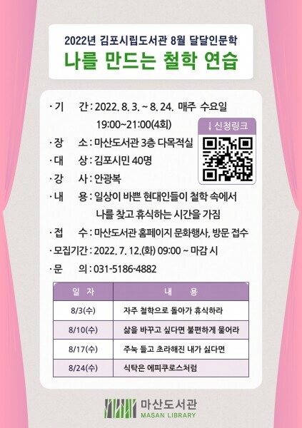 1주차는 ‘자주 철학으로 돌아가 휴식하라’, 2주차는 ‘삶을 바꾸고 싶다면 불편하게 물어라’, 3주차는 ‘주눅 들고 초라해진 내가 싫다면’, 4주차는 ‘식탁은 에피쿠로스처럼’으로 구성되며 자세한 내용은 마산도서관 홈페이지 문화행사 신청에서 확인할 수 있다.