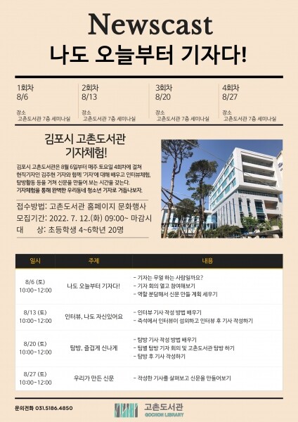 소영만 김포시립도서관장은 “현직 기자와 함께하는 이번 진로독서프로그램을 바탕으로 청소년들의 다양한 자질을 키우고 지역사회와 소통하는 도서관의 역할을 강화해 나가겠다”고 말했다.