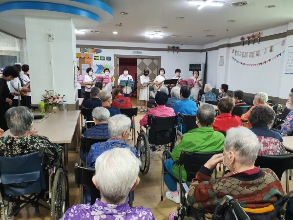 이날 봉사에는 우쿨렐레 수강생 12명, 플루트 연주자 3명, 기타 연주와 노래봉사자 2명이 참여해 다채로운 연주와 노래를 선보였으며 50여명의 어르신과 종사자들이 박수와 환호로 답하는 등 봉사자와 대상자 모두가 행복한 시간을 보냈다.