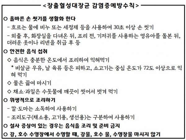 아울러 조리도구를 구분해 사용하고 설사 등의 증상이 있을 때에는 음식을 조리하지 않는 등 조리 시 위생수칙을 준수해야 한다.