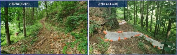 가평상담소 장기원상담관은 민원이 빠르게 처리될 수 있도록 가평군 산림과에 전달했으며 관련부서에서는 민원인 주택 상단 임야 공사부지 내 우수가 주택으로 흐르지 않도록 사면에 토사 배수로 설치작업을 완료했고 주택과 접한 사면 내 낙석을 방지할 수 있는 시설 등은 자력으로 조치해야 할 사항임을 민원인에게 설명했다.