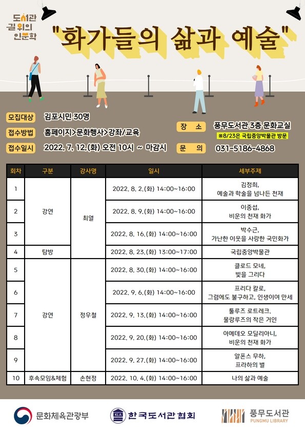 최열 강사는 한국 화가를, 정우철 강사는 서양 화가를 중심으로 강연하고 손현정 강사는 체험 활동을 통해 참여자들의 이야기를 그림에 담아보는 강연을 진행할 예정이다.