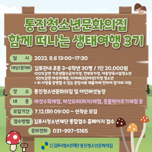 오는 7월 12일 09:00부터 선착순으로 참가자를 모집하며 김포시청소년재단 홈페이지 온라인통합접수시스템에서 신청 가능하다.