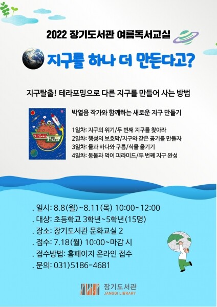 오전 10시부터 12시까지 진행되는 이번 독서교실은 테라포밍이라는 SF적인 이색 소재의 과학책을 통해 지구와 우주에 관한 과학적 상상력을 키우고 지구의 소중함에 대해 다시 한번 생각해 보는 시간을 갖게 될 예정이다.