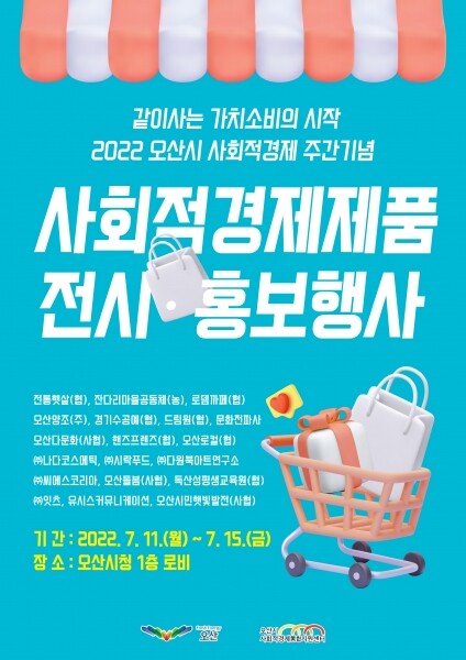 홍보·전시 행사에는 관내 19개 사회적 경제 기업이 참여해 수공예제품부터 안전한 먹거리까지 다양한 제품을 전시·홍보하며 오산시에서는 사회적경제 대시민 홍보와 사회적 경제 기업의 판로지원을 위해 오산함께장터를 운영 중으로 다양한 제품 및 서비스를 만나볼 수 있다.