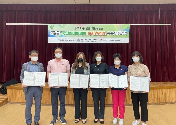 이번 협약식에 참여한 임대아파트 4개 단지에는 현재 2,297세대, 5,295명이 거주하고 있으며 그중 복지 대상자는 기초생활수급자 450세대, 기초주거지원 276세대, 차상위 531세대, 장애인 460세대로 호평동 전체 복지 대상의 53%를 차지하고 있다.
