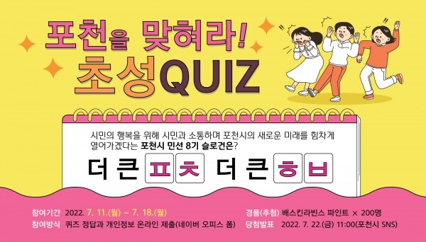 기간은 7월 11일부터 18일까지로 참여방법은 시민의 행복을 위해 시민과 소통하며 포천시의 새로운 미래를 힘차게 열어가겠다는 포천시 민선8기 슬로건의 빈칸 초성을 네이버 폼에 입력하면 된다.