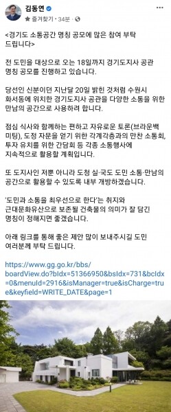 김 지사는 11일 자신의 사회관계망서비스를 통해 “전 도민을 대상으로 오는 18일까지 경기도지사 공관 명칭 공모를 진행하고 있다”며 “당선인 신분이던 지난달 20일 밝힌 것처럼 수원시 화서동에 위치한 경기도지사 공관을 다양한 소통을 위한 만남의 공간으로 사용하려 한다”고 말했다.