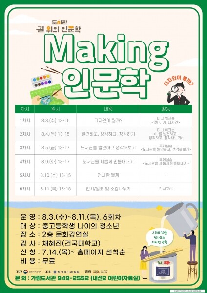 ‘Making 인문학’ 프로그램은 시각디자인, 공간디자인 등 다양한 디자인 경험을 쌓으며 개인의 삶을 성찰할 수 있는 프로그램으로 문화체육관광부 주최, 한국도서관협회가 주관하는 ‘도서관 길 위의 인문학’ 공모 사업에 지난해에 이어 2년 연속 선정됐다.