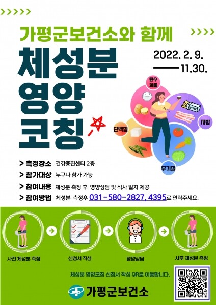 ‘체성분 영양코칭’ 프로그램 신청방법 등 자세한 내용은 가평군보건소 홈페이지 내 건강이야기에서 확인하거나 보건소 건강증진팀 영양사업 담당자580-2827)에게 문의하면 된다.