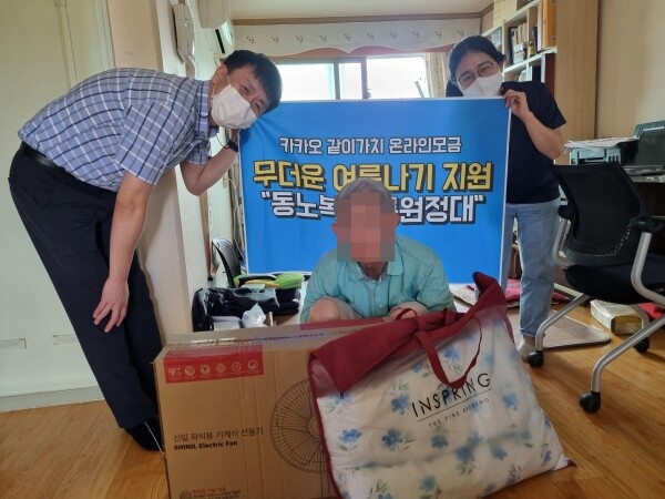 이번 지원 행사는 온라인 모금 카카오 같이가치 “무더운 여름, 녹아내리는 저소득 어르신의 삶”이라는 주제로 두 달 동안 모금을 진행해 2,543,800원의 후원금이 모여 무더위로 고생하는 어르신들이 건강하고 안전한 여름을 보낼 수 있도록 선풍기 및 풍기 인견이불을 지원하게 됐다.