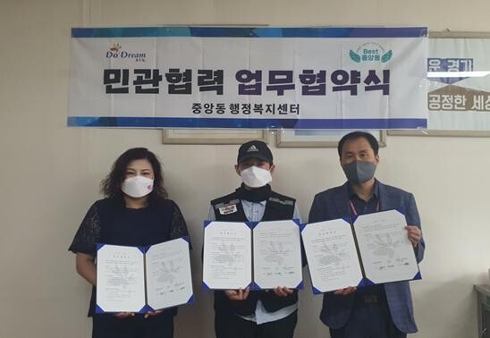 이날 오전 진행된 협약식에는 세 기관의 대표와 관계자가 참석했고 중앙동 행정복지센터와 함께 복지사각지대 발굴 및 민·관 자원 물품 배송 지원에 관해 상호 협력하기로 합의했다.