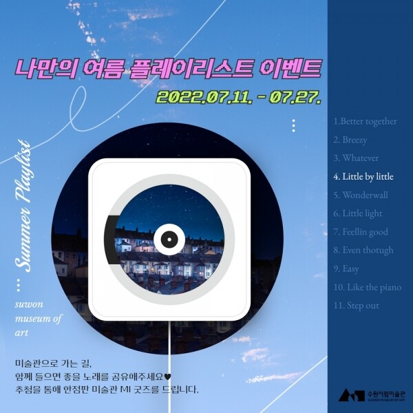 당첨자 발표는 7월 29일 수원시립미술관 SNS를 통해 게시되며 추천받은 플레이리스트는 미술관 SNS와 미술관 현장에서 추후 공개된다.