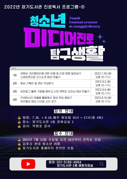강좌의 접수는 2022년 7월 13일 수요일 오전 10시부터 홈페이지를 통한 온라인 접수로 진행하며 김포시 관내 청소년 선착순 25명을 모집한다.