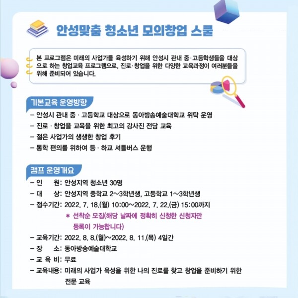 교육대상은 안성시에 주소지를 두고 있거나 관내 소재 학교에 재학 중인 중·고생 30명을 선착순으로 모집하며 참여를 원하는 자는 동아방송예술대학교 평생교육원 블로그를 참고해 오는 7월 18일 오전 10시부터 7월 22일 오후 3시까지 신청서를 제출하면 된다.