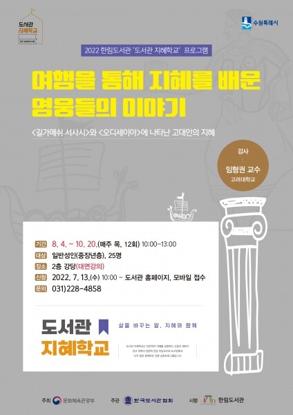 한림도서관 홈페이지 ‘통합예약/신청→독서문화프로그램’에서 ‘도서관 지혜학교: 여행을 통해 지혜를 배운 영웅들의 이야기’를 선택해 신청하면 된다.