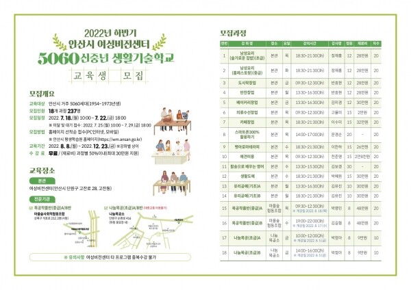 모집기간은 이달 18일 오전 10시부터 22일 오후 6시까지이며 안산시 여성비전센터 누리집을 통해 과정별로 선착순 모집한다.
