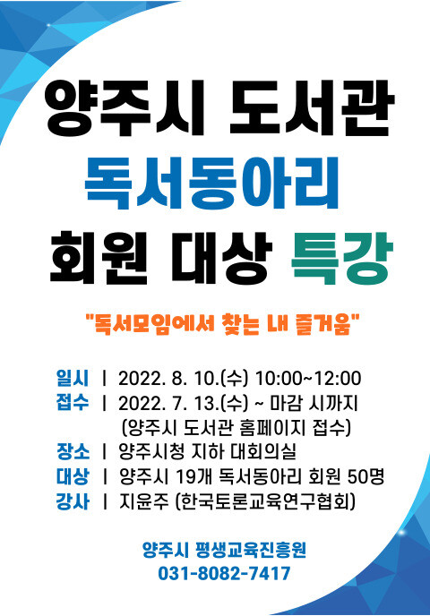 참여신청은 양주시도서관 홈페이지에서 13일부터 선착순으로 개별 접수할 수 있으며 수강료는 무료이다.