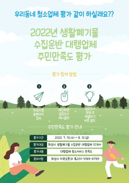 7월 13일부터 8월 12일까지 실시되는 이번 조사는 생활폐기물 수집·운반 대행업체의 청소서비스에 대한 만족도를 평가해 시민들에게 보다 나은 청소서비스를 제공하기 위해 실시된다.