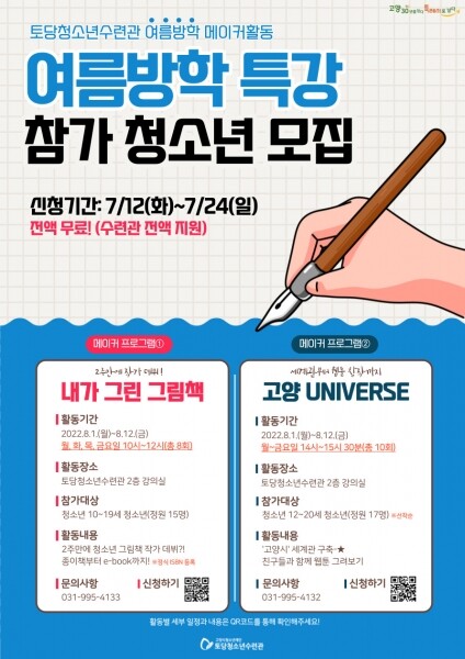 여름방학 특강은 그림책과 웹툰을 창작하는 문화예술 메이커프로그램으로 8월 1일부터 8월 12일까지 운영하고 4차 산업혁명 시대의 필수 핵심 교육으로 주목받고 있는 메이커 활동은 청소년이 문화예술의 수동적 소비자를 벗어나 창작활동 직접 참여로 능동적 창조자가 될 수 있는 역량을 키워준다.