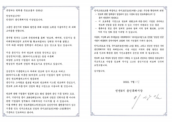 이를 위해선 용인 반도체클러스터와 삼성전자와 플랫폼시티가 있는 기흥을 잇는 민자고속도로 건설과 국지도 57호선 확장이 시급하고 긴요하다”고 밝혔다.