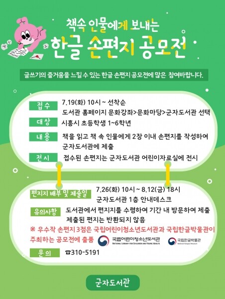 참여를 희망하는 초등학생은 원하는 책을 읽은 다음, 도서관에서 편지지를 수령하고 책 속 인물에게 보내는 한글 손 편지 1~2매를 작성해 8월 12일까지 군자도서관 1층으로 방문·접수하면 된다.
