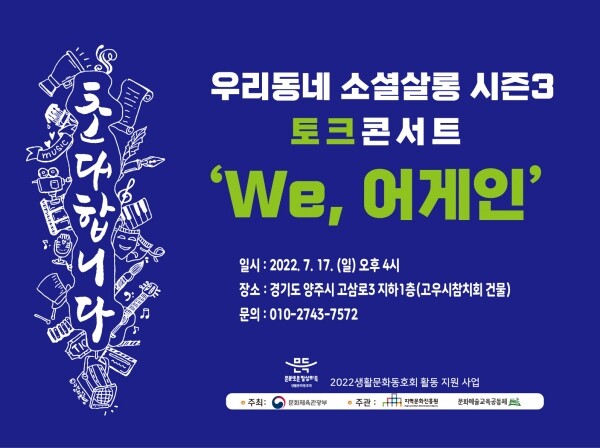 한편 ‘우리동네 소셜살롱’은 2019년 우리동네소셜살롱 시즌1 ‘우리동네 마실가歌요樂’를 시작으로 2020년 우리동네소셜살롱 시즌2 ‘책방1열’, 2022년 우리동네소셜살롱 시즌3 ‘WE, 어게인’으로 이어지고 있다.