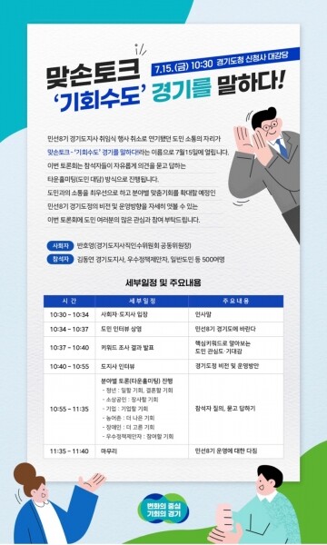 낮은 자세로 도민과 소통하고 도민의 목소리를 적극 반영하겠다는 김 지사의 의지가 담긴 이번 행사는 ‘기회수도 경기’를 주제로 민선 8기 경기도정의 비전과 운영방안에 대한 대담이 진행될 계획이라고 전했다.