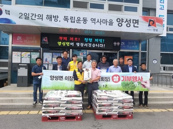 양성면 이장단협의회는 “기탁 물품은 모든 회원들이 한마음 한뜻으로 사랑의 마음을 담아 마련한 것”이라고 밝혔다.