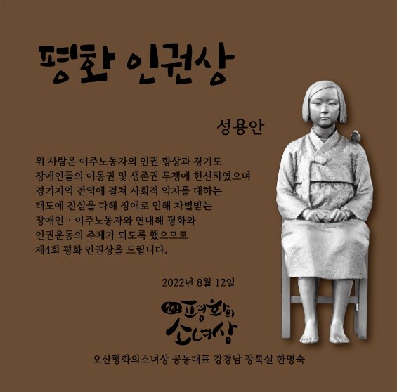 오산 평화의 소녀상 관계자는 “성용안님은 부모와 어릴적 헤어지면서 힘든 시절을 보내왔다 2007년부터 오산에 거주했고 오산 이주노동자센터에서 일을 시작했다 이때부터 이주노동자에 대한 인권 지원활동을 계기로 힘들고 어려운 사람들을 위해 무급으로 자원 활동을 하면서 인권운동의 주체가 되도록 노력했으므로 제4회 평화·인권상 수상자로 선정됐다”고 밝혔다.