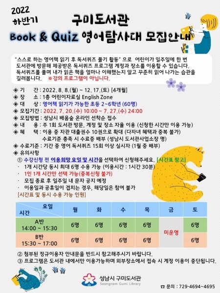 성남시 관계자는 “구미도서관은 지역내 15곳 공공도서관 중에서 어린이 영어원서가 가장 많은 곳”이며 “해당 프로그램은 참여 학생들에게 영어책을 재미있게 읽고 자기 주도적 읽기 습관을 들이는 계기를 만들어 주게 될 것”이라고 말했다.