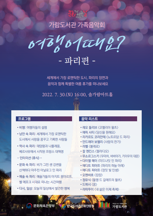 이번 공연은 문화체육관광부가 주최하고 한국도서관문화진흥원이 주관하는 ‘2022년 공공도서관 문화가 있는 날’ 사업으로 가람도서관이 시행 공공도서관으로 선정되어 진행하는 공연이다.