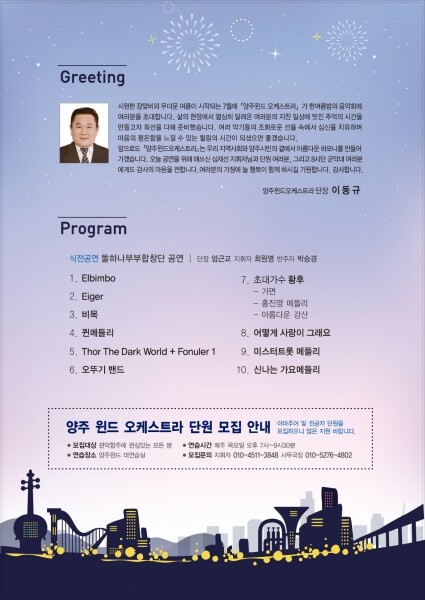 이동규 단장은 “무더운 여름의 시작점에서 개최되는 이번 여름 음악회가 양주 윈드오케스트라만의 조화로운 선율을 통해 삶의 현장에서 열심히 달려온 양주시민과 국군장병에게 심신의 치유와 마음의 평온함을 느낄 수 있는 힐링의 시간이 되기 바란다”고 밝혔다.