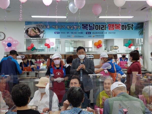 조한석 관장은 식사에 앞서 어르신들께 “매년 진행된 복날 맞이 행사를 올해는 500 여명의 어르신들을 모시고 진행하게 되어 기쁘고 오늘 저희 기관에서 준비한 따뜻한 삼계탕과 시원한 수박을 많이 드시고 더위 잘 이겨내시라”고 응원했다.