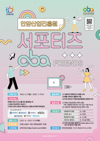 또한 ‘안양산업진흥원 서포터즈 : aba프렌즈’의 모집기간은 6월 27일부터 7월 27일 진행되며 온라인으로 접수를 받는다.