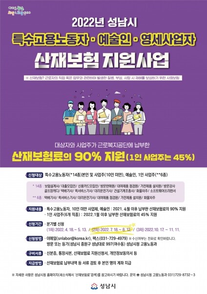 성남시는 보건복지부와 사회보장제도 변경 협의를 거쳐 지난해 특수고용직과 예술인을 대상으로 하는 산재보험료 지원사업을 도입한 이후 올해 대상자를 6개 직종의 1인 사업주로 확대했다.