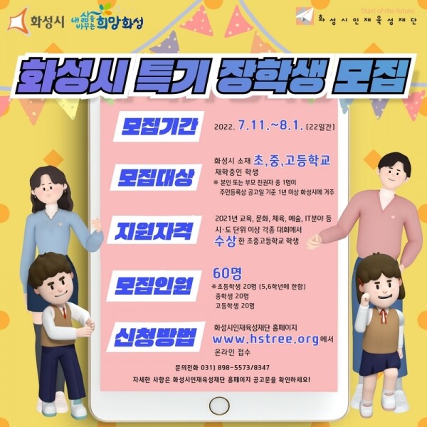 화성시인재육성재단 김태호 대표이사는 “재단은 장학금 지원을 통해 관내에 재능이 우수한 지역인재를 발굴하고 지역사회가 필요로 하는 인재를 양성하고자 한다”며 “화성시의 재능 있는 청소년들의 많은 지원을 바란다”고 말했다.