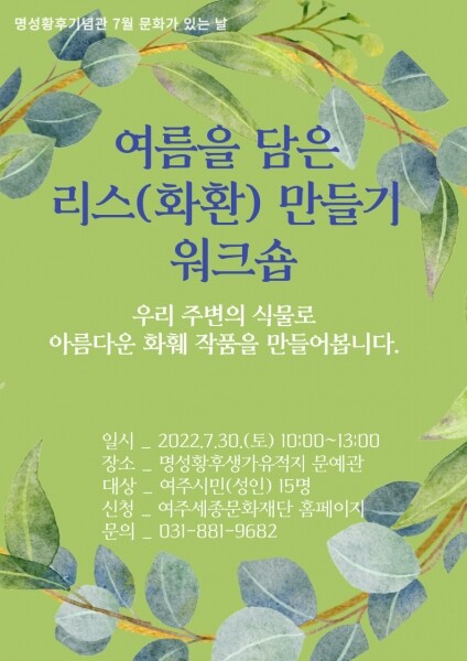 다양한 여름의 생태를 관찰하고 이를 활용한 예술작품을 만들어보는 기회를 제공하고자 기획된 이번 프로그램은 관내 예술인인 조은혜 플로리스트가 강사로 나서 여주시민들과 아름다운 식물 장식품을 만드는 시간을 갖는다.