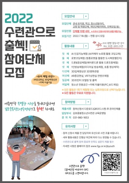 접수는 수련관 마을연계사업 담당자 사전 일정조율 후 참여신청 QR코드 스캔 후 온라인 제출하면 되고 모든 체험은 무료로 운영된다.