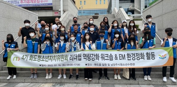 이날 화도읍 청소년자치위원회는 골목길 플로깅과 도뮤토아파트 앞 배롱내천에 EM 흙공을 투척하는 환경 정화 활동을 시작으로 남양주시청소년수련관에서 청소년 자치 역량 강화 리더십과 환경 교육을 실시했다.