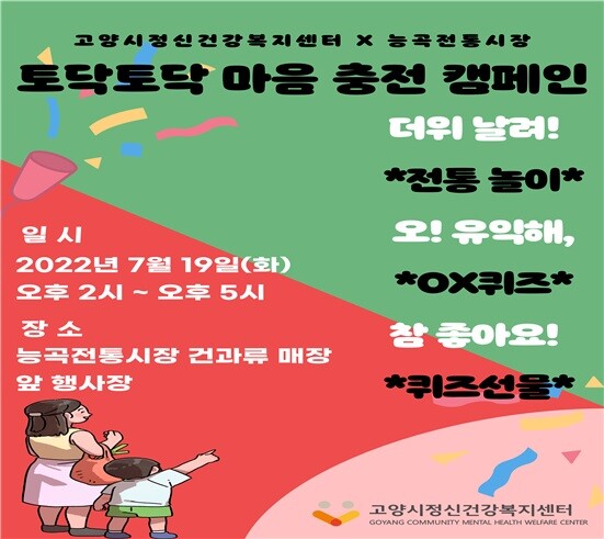 한편 코로나19 장기화로 전통시장 경기가 침체되어 소상공인의 우울·불안이 커지자 고양시정신건강복지센터는 능곡전통시장 상인 및 이용주민을 대상으로 ‘소상공인 마음건강 토탈서비스’를 진행하고 있다.