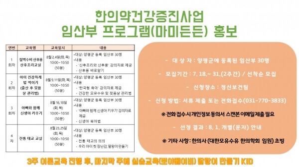 교육은 주 2회, 4주간 10시부터 10시 50분까지 진행되며 한의약 건강관리 서비스와 모유 수유에 관한 전문적인 지식이 있는 전문 강사와 함께 철벽수비 산후풍 산후조리 교실 출산 후 젖몸살 관리법 아빠와 함께 신생아 키우기 전통 태교 교실로 구성됐다.