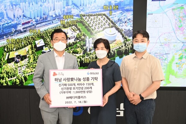 ㈜메디미플러스는 2006년 설립한 약국과 병원 전문 유통기업으로 2021년 신기패 1000개를 기탁한 것을 비롯해 올해 4월 생활용품을 기탁하는 등 하남시의 어려운 이웃을 위해 꾸준히 나눔을 실천해오고 있다.