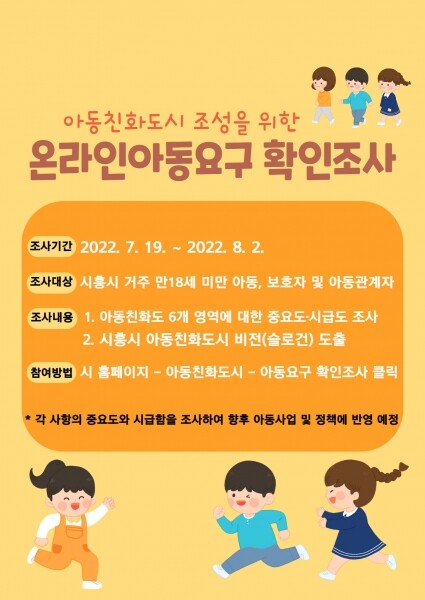시 관계자는 “이번 아동요구 조사는 아동친화도시 4개년 계획 수립을 위해 다양한 시민 의견을 반영하기 위한 설문조사인 만큼, 시민들의 많은 관심과 참여를 부탁드린다”고 당부했다.