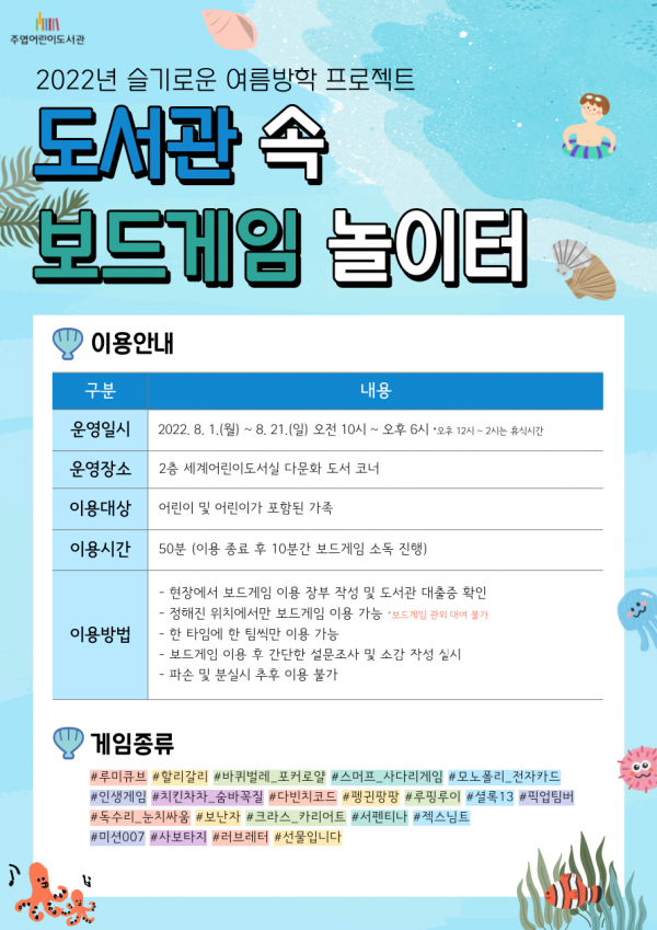 올해 여름방학 보드게임 대여 서비스는 도서관에서 원하는 보드 게임을 바로 즐기는 현장 참여 방식으로 운영될 예정이다.