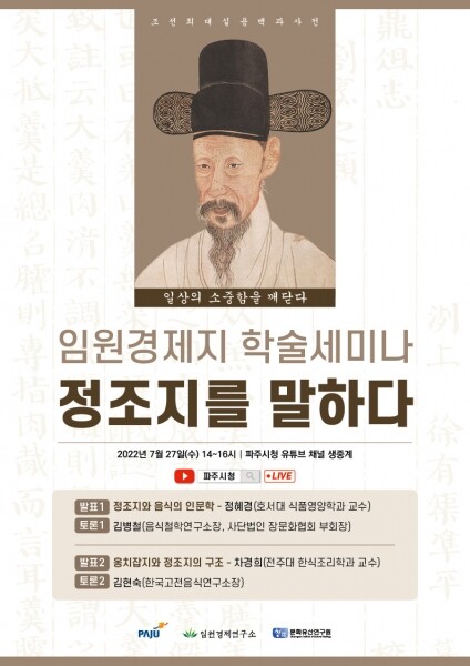 이번 학술세미나는 파주 장단 출신 풍석 서유구 선생의 실용백과사전인 ‘임원경제지’를 널리 알리고자 기획한 ‘임원경제지 학교’의 일환으로 마련했으며 임원경제지-정조지편을 세부 주제로 다룬다.