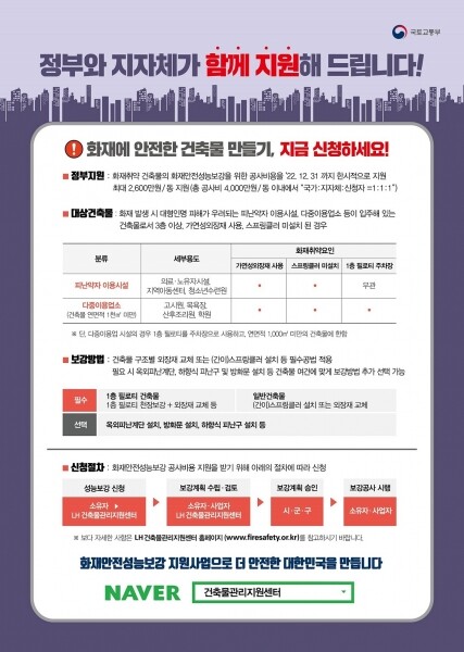이에 시는 화재에 취약한 건축물 소유자에게 화재안전성능 보강공사 비용 부담을 완화하기 위해 총 공사비 4,000만원 이내에서 최대 2,600만원을 지원한다.