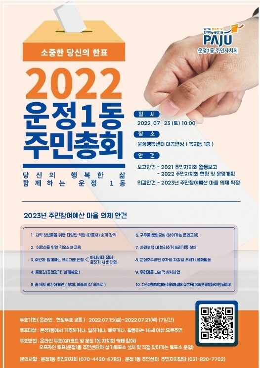 사전투표는 만 16세 이상 운정1동 주민, 사업장 종사자, 학교, 기관 단체에 속한 사람은 누구나 참여할 수 있으며 투표는 운정1동 행정복지센터와 지역 내 5개 상가 투표소에서 진행되며 많은 주민들이 참여할 수 있도록 운정1동 주민자치회 카페와 포스터 등의 QR코드를 통해서도 투표할 수 있다.