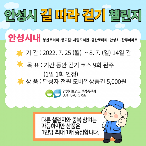 안성시보건소 관계자는 “앞으로도 걷기 코스를 지속적으로 발굴해 다양한 형태의 걷기 챌린지를 운영할 계획”이라며 “무더운 날씨 속 가벼운 걷기를 통해 건강하고 즐겁게 여름을 보내시길 바란다”고 말했다.