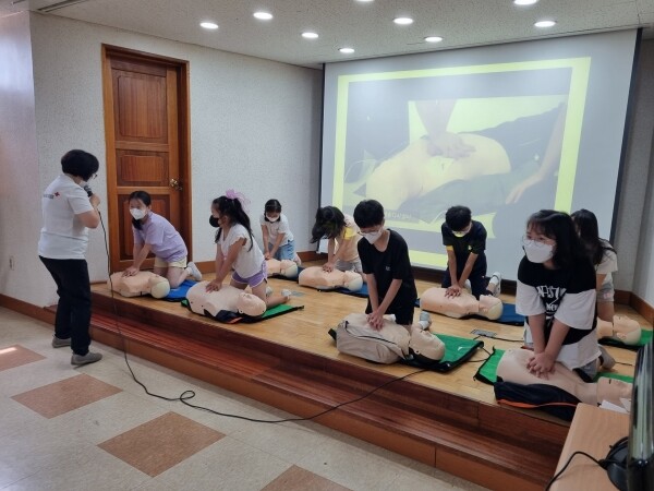 7월 18일부터 19일까지 이틀간 가능초등학교에서 진행한 심폐소생술 교육은 약 230명의 학생들을 대상으로 학교 별관 시청각실에서 오전 2회씩 진행했다.